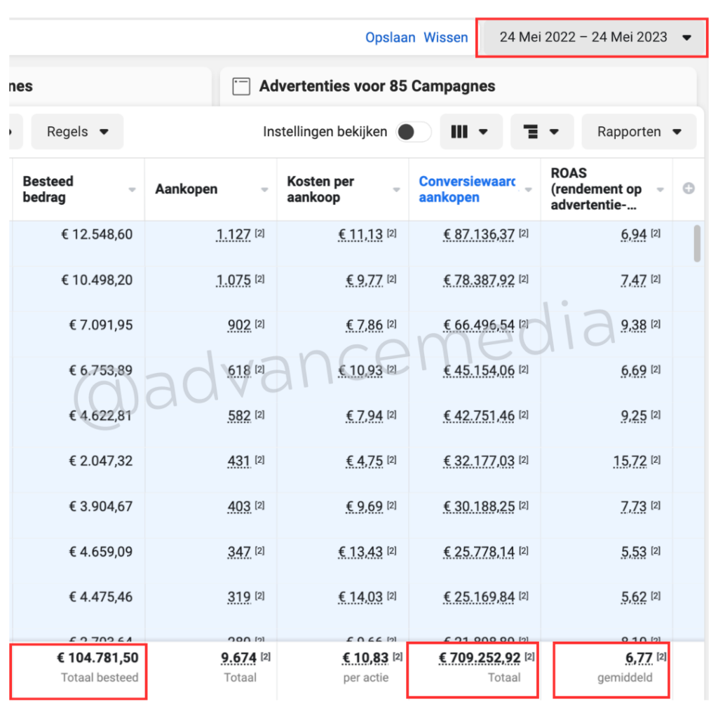 Uitgave: €104.781 | Omzet: €709.525 💰| ROAS: 6.77